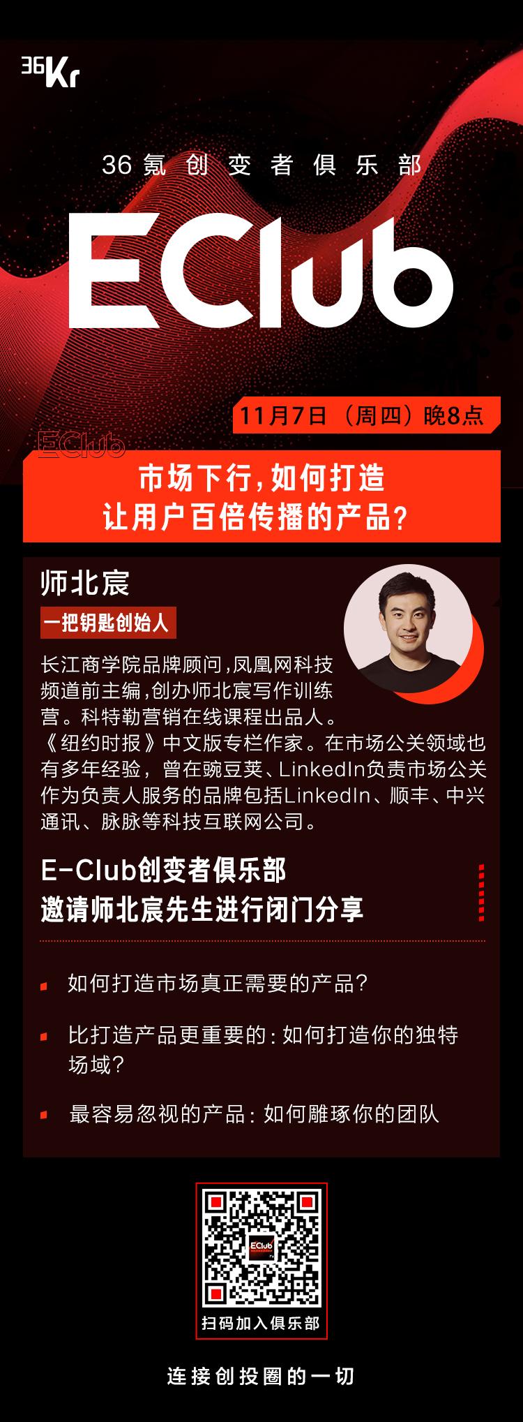 继10月3位大咖嘉宾的分享后,11月份大咖分享时间和内容也已经火热出炉,为了帮助初创企业从0到1,从1到无限,作为36氪「EClub创变者俱乐部」“融资无忧”权益的重磅组成部分,11月7日晚8点,36氪邀请到了一把钥匙创始人师北宸先生为我们带来“市场下行,如何打造让用户百倍传播的产品?”的精彩分享,帮助创业者们打造符合市场需要的产品并拥有自己的独特场域。