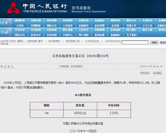 2019年11月5日,央行开展中期借贷便利(MLF)操作4000亿元,期限为1年,中标利率为3.25%,较上期下降5个基点(之前是3.3%)。今日有4035亿元中期借贷便利(MLF)到期,这是年内第三大规模的MLF到期量。市场此前普遍认为,央行下调MLF利率的机会较小,而此次下调中标利率5基点,令市场意外。