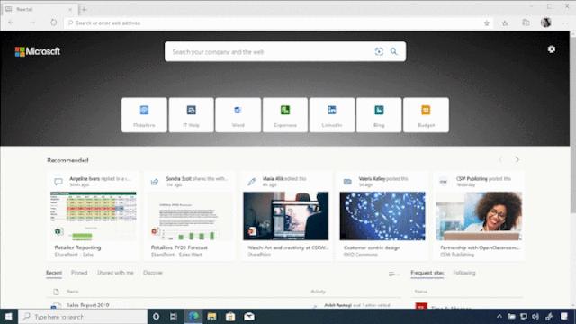 在这次大会上,微软发布了一款基于Chromium内核的全新Edge浏览器。这款浏览器支持为企业用户提供新的标签页,让企业用户可以直接访问Microsoft 365文档、站点或者进行内部网络搜索,把每个标签页变成了新的办公入口。此外,这款新的Edge还适用于所有设备平台,包括移动终端,用户在手机上就可以检索公司的文件。