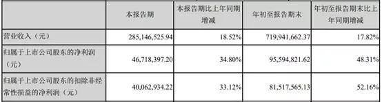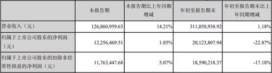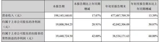 2019年第三季度,实丰文化实现营收1.26亿元,比上年同期增长14.21%;净利润为1225.64万元,比上年同期增长1.85%;扣非净利润为1176.34万元,比上年同期增长5.07%。