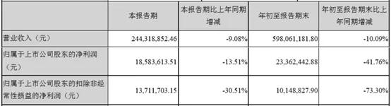 2019年第三季度,高乐股份实现营收2.44亿元,比上年同期增长 -9.08%;净利润为1858.36万元,比上年同期增长-13.51%;扣非净利润为1371.17万元,比上年同期增长-30.51%。