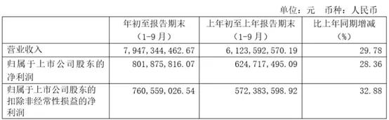 2019年前三季度,晨光文具共实现营收79.47亿元,比上年同期增长29.78%;净利润为8.01亿元,比上年同期增长28.36%;扣非净利润为7.60亿元,比上年同期增长32.88%。