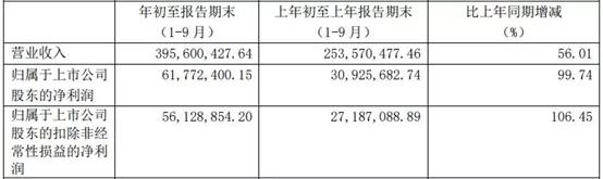 2019年前三季度,邦宝益智实现营收3.95亿元,比上年同期增长56.01%;净利润为6177.24万元,比上年同期增长99.74%;扣非净利润5612.88万元,比上年同期增长106.45%。