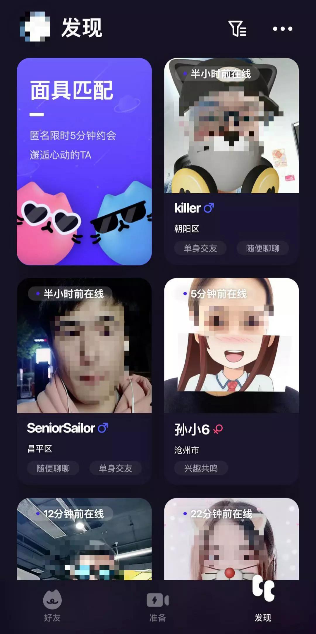应用主体界面包括了好友、准备、发现三大栏目。设置完成后,用户每次打开APP都默认进入“准备”一栏,借助与“LIVE名片”设置界面相同的面具和美颜功能,用户可以调整自己在视频聊天时的形象。
