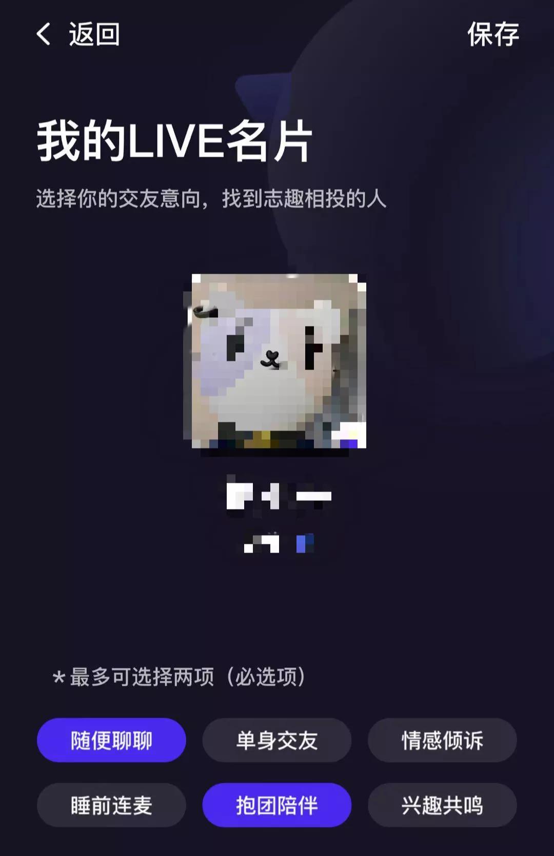 在设置“LIVE名片”时,用户必须选择文字标签,且暂无法自定义,当前包括了随便聊聊、单身交友、情感倾诉、睡前连麦、抱团陪伴、兴趣共鸣六个标签,最多选择两项。
