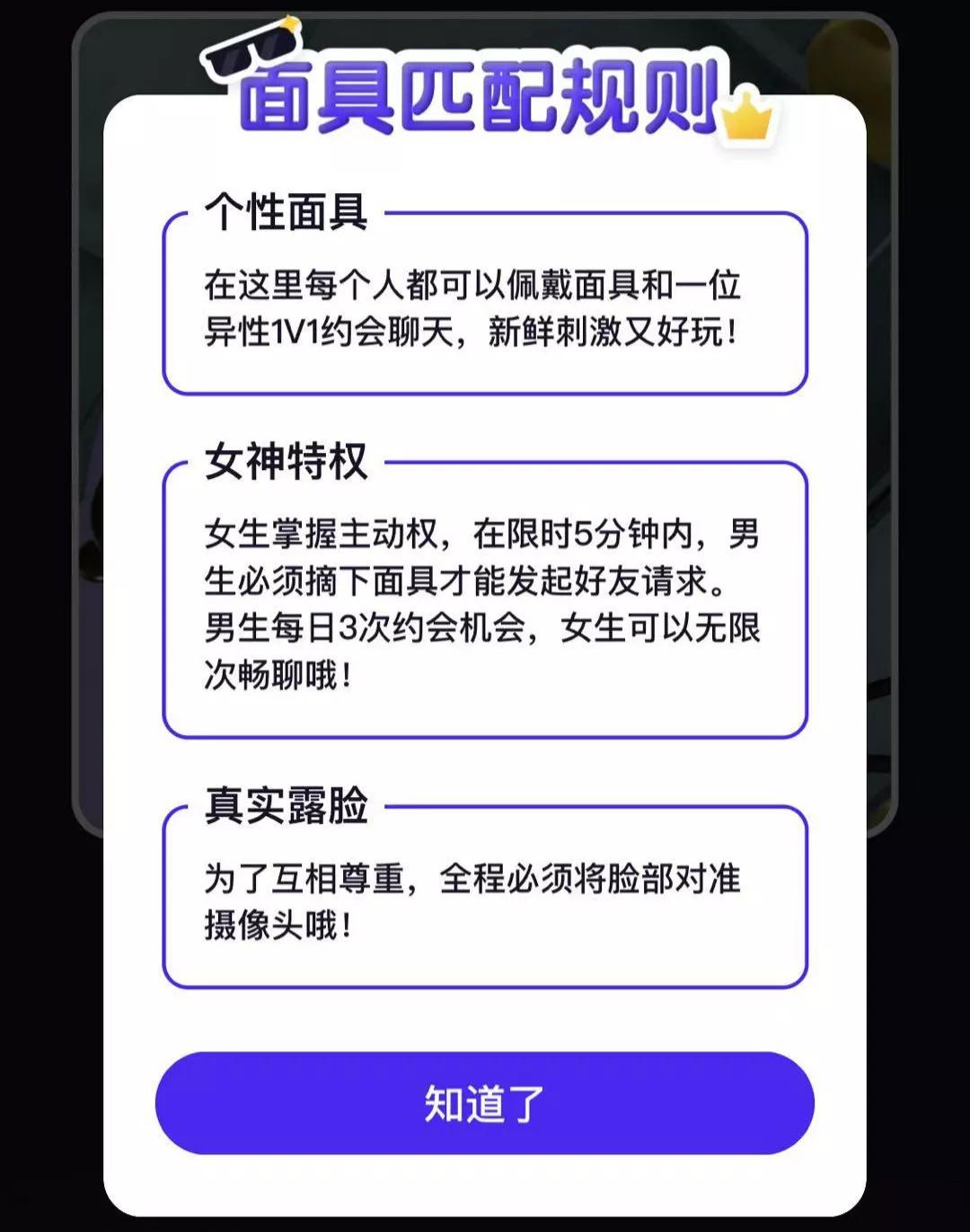 在这一过程中,用户首先需要全程将脸部对准摄像头,可以使用面具,但却包含了针对性别的不同限制,男生必须摘下面具才能发起好友请求,且每天只有3次约会机会,女生则可以无限畅聊。