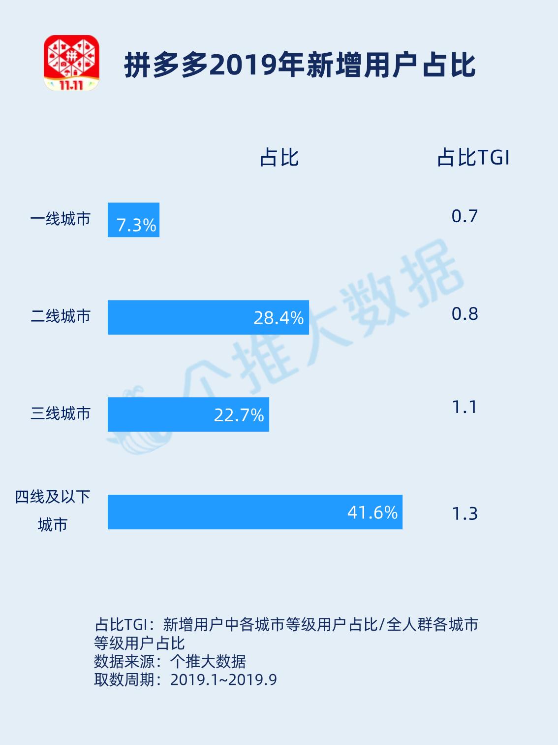 个推大数据显示,2019年(截至9月)淘宝70.6%的新增用户、拼多多64.3%的新增用户均来自于三线及以下城市,且新增用户中三线及以下城市用户占比TGI均超过1,低线城市已成淘宝、拼多多新增用户的主要来源。(TGI,指APP新增用户中各线城市用户占比与全量人群各线城市用户占比的比值,若TGI>1,说明该线城市新增用户占比显著,且TGI越高,该线城市对APP的新增用户实际贡献越多。)