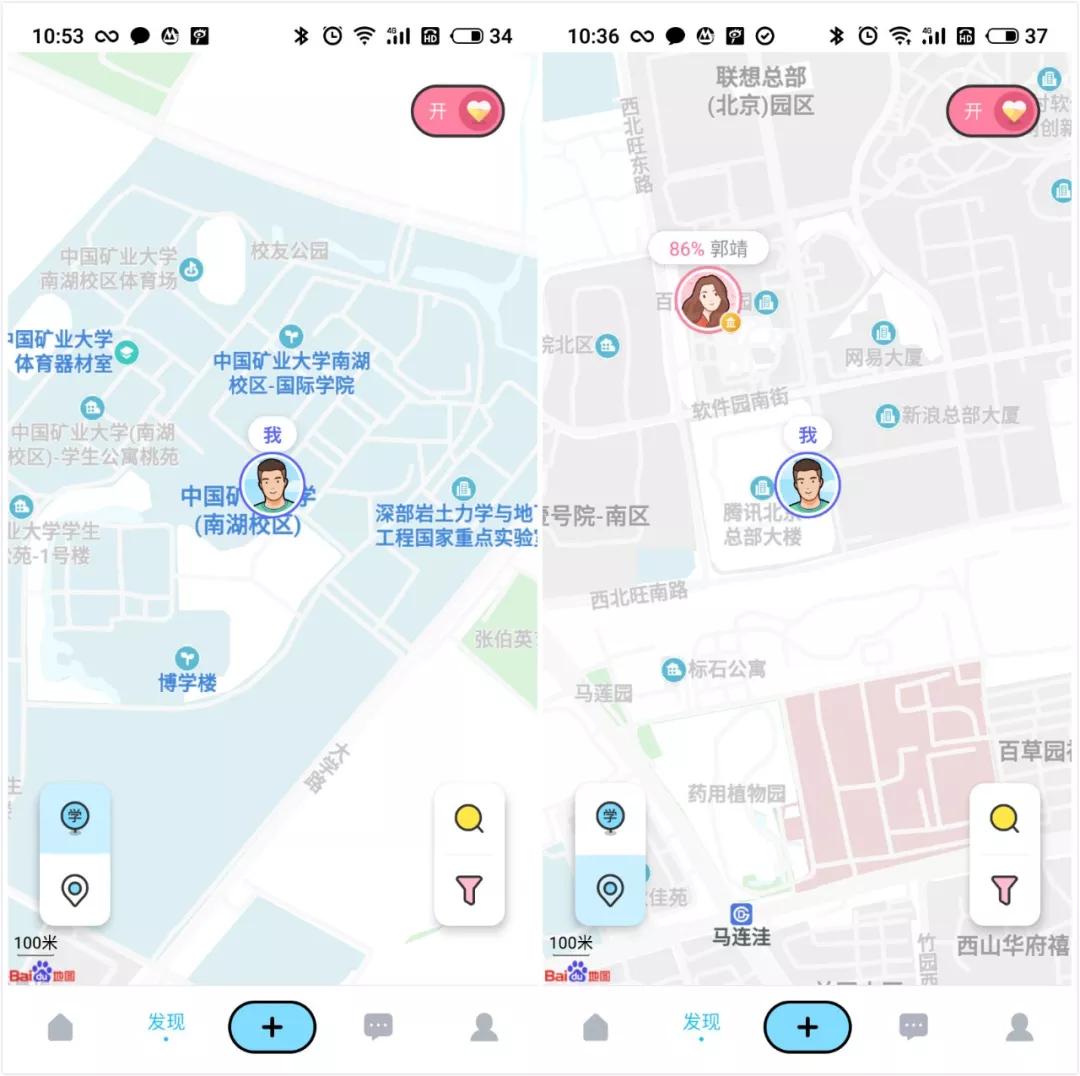 其二,地图社交。听筒接入百度地图功能,用户可在“学校位置”和“实际位置”间进行自由切换,查看周边好友。