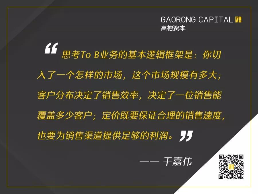 总结一下,思考To B业务的基本逻辑框架是:你切入了一个怎样的市场,这个市场规模有多大;客户分布决定了销售效率,决定了一位销售能覆盖多少客户;定价既要保证合理的销售速度,也要为销售渠道提供足够的利润。