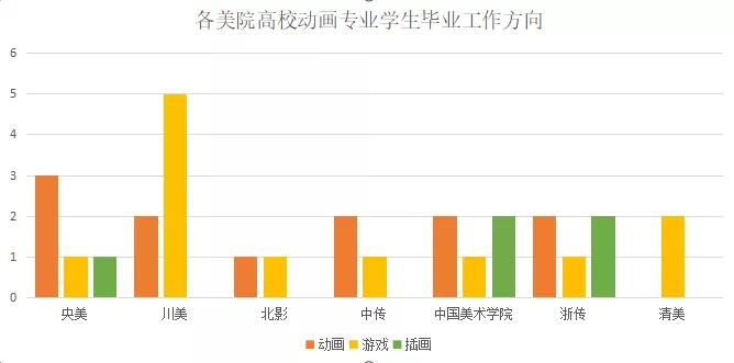 在我们统计的各大高校中,除去出国留学以及转行的部分毕业生,从事动画、游戏、插画相关行业的毕业生的高校比例如上图所示。