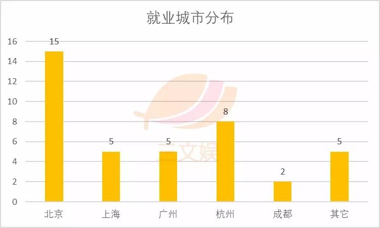 62.5%的人在北上广这样的一线城市工作(其中北京最多,占到总数的37.5%),有20%的人选择在杭州工作,这也和杭州的动漫文化产业的发展有关。这个地理区域的分布,和三文娱此前2019年上半年动画行业的人才报告所统计的招聘公司地域分布相吻合。一线城市的工作机会更多,人才政策支持以及资金条件更好。
