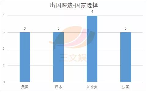 根据问卷数据,再结合一些业内动态,能发现动画专业的学生出国留学已成为常态。在此次调查中本科毕业后出国深造的毕业生中,对于国家的选择集中在美国、日本、法国、加拿大这些国家。这个结果在意料之中,美国、日本不用说,作为IP输出大国,动画历史发展悠久,工业流程完整,制作水平较高自然成为出国的首选。法国高布兰学院在动画教育领域世界排名第一,而加拿大更是被誉为美国动画的“后花园”,动画制作已十分成熟。
