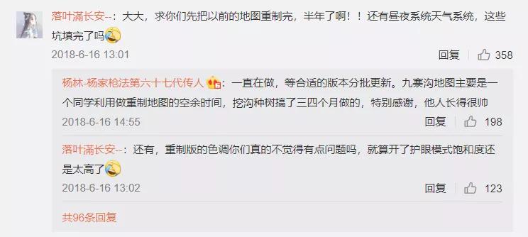 去年6月,一位玩家在杨林的个人微博下留言,吐槽重制版游戏色调饱和度太高了,一直习惯不了,评论收获了大批点赞。