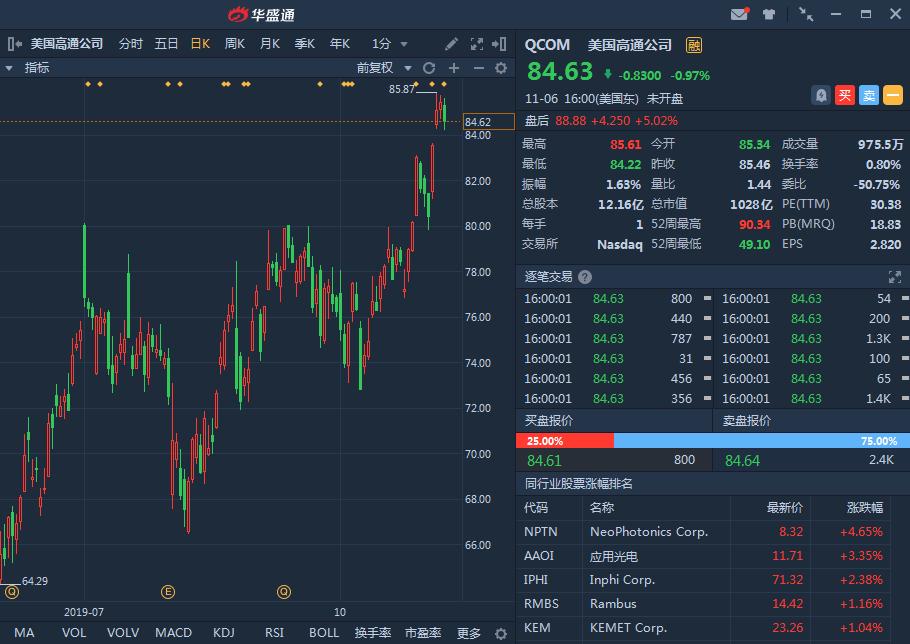 高通周三盘后发布了2019财年第四财季财报,收入及盈利降幅好于分析师预期,且公司业绩指引超预期,管理层对明年5G的进展充满信心,受业绩影响,公司股价盘后涨超5%,今年年内涨幅近50%。