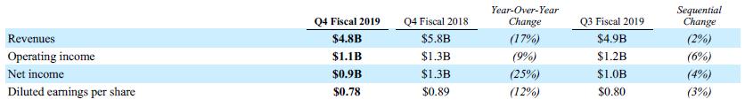 股票回购:Q4宣布300亿美元股票回购计划,截至2019年9月29日仍有71亿美元的授权回购。10月15日宣布派发每股0.62美元的现金股利,将于2019年12月19日支付。
