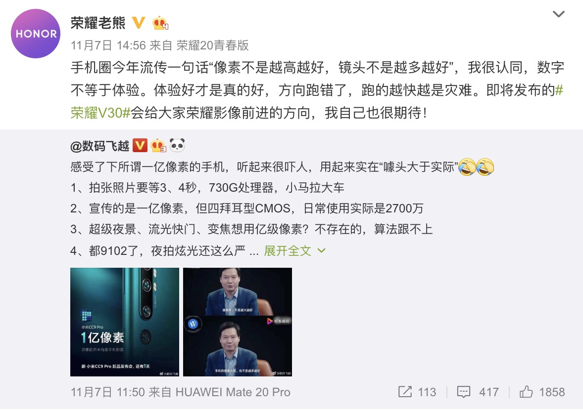 在怼完小米电视之后,熊军民也没放过小米手机。除了电视之外,与小米电视5 Pro同时发布的还有业界首款一亿像素手机小米CC9 Pro。在权威相机评测网站DxOMark上,CC9 Pro尊享版的后置拍照水准与Mate30 Pro并列第一,均为121分。