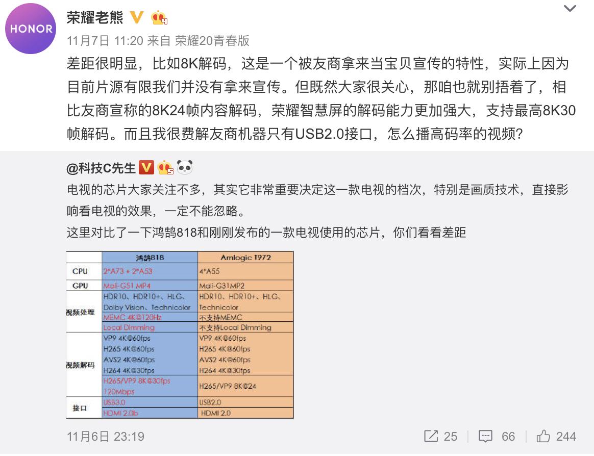 11月5日,小米发布了小米电视5系列,包括小米电视5和5 Pro两个型号,全系支持8K解码,小米电视部总经理李肖爽说这“可能是画质最好的小米电视”。仅仅两天后,荣耀业务部副总裁(产品)熊军民就在微博上开怼,称荣耀的视频解码能力更为强大,之所以没有拿8K解码拿来宣传,是因为目前片源有限。单论技术层面,熊军民称两者“差距很明显”,小米电视5 Pro仅仅支持USB2.0接口,“怎么播高码率的视频?”相比之下,荣耀智慧屏是支持USB3.0接口。