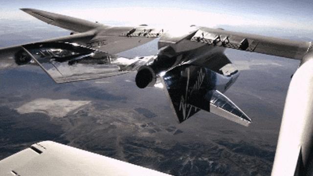 连体大飞机中间运载着一架小飞机,大飞机飞行到50000英尺高空释放小飞机,小飞机加速进入太空。