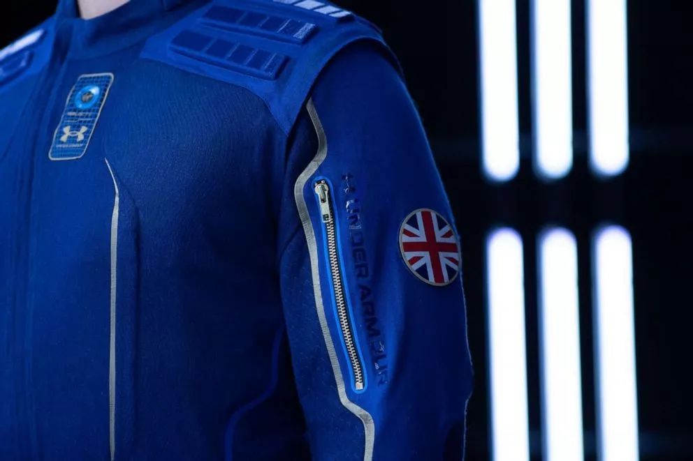 宇航服的左胸绣着维珍银河与Under Armour的联名logo,左侧手臂上印着宇航员的国籍。