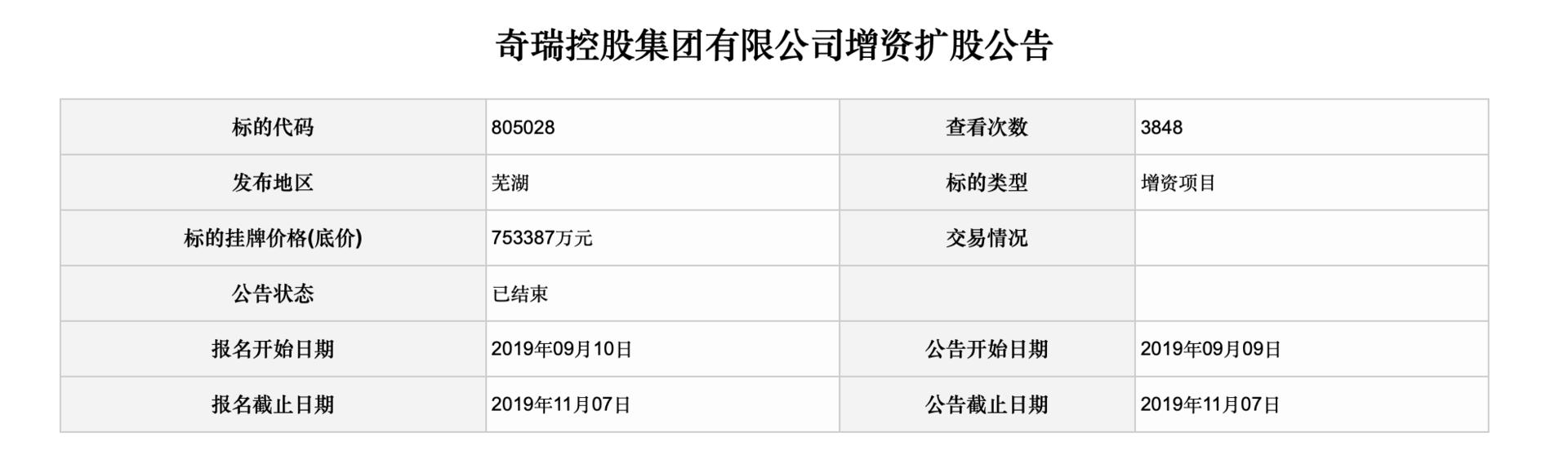 奇瑞增资扩股项目挂牌结束,5个工作日内将公布结果