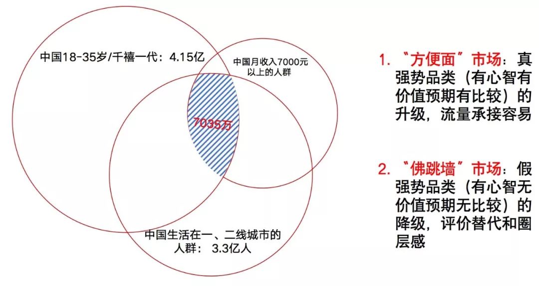 根据华映研究部的数据来看:下图三个圈,一个是中国18-35岁人群(即千禧一代),规模大概4.15亿;一个是月收入 7000 元以上人群;一个是一二线常驻人群。三类人的交集大约有 7035 万人。