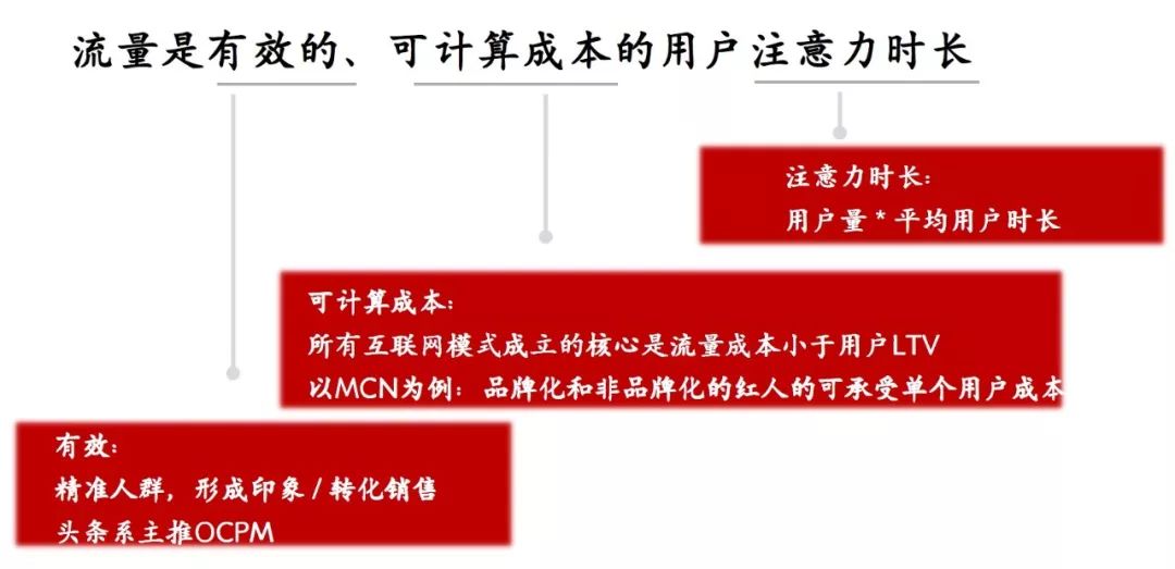 我们认为,流量是有效的、可计算成本的用户注意力时长。为什么这么说?最开始我们关注了一些泛流量的公司,但很快发现以下问题: