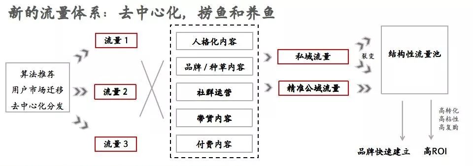 因为大众的基础需求被满足,所以整个流量体系变成一个分布式的,成了分散的湖泊。抖音和快手的崛起把整个流量组织层变成了算法推荐的,其次,流量分发方式变成去中心化的,这就意味着整个流量体系越来越分散。