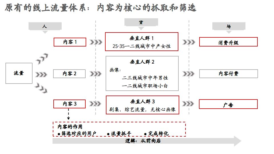 在 2018 年以前,整个线上流量体系其实是以内容为核心去抓取和筛选的。你可以把流量比作一片大海,用不同的内容网去海里捞鱼。想捞什么样的鱼,就投什么样的网。