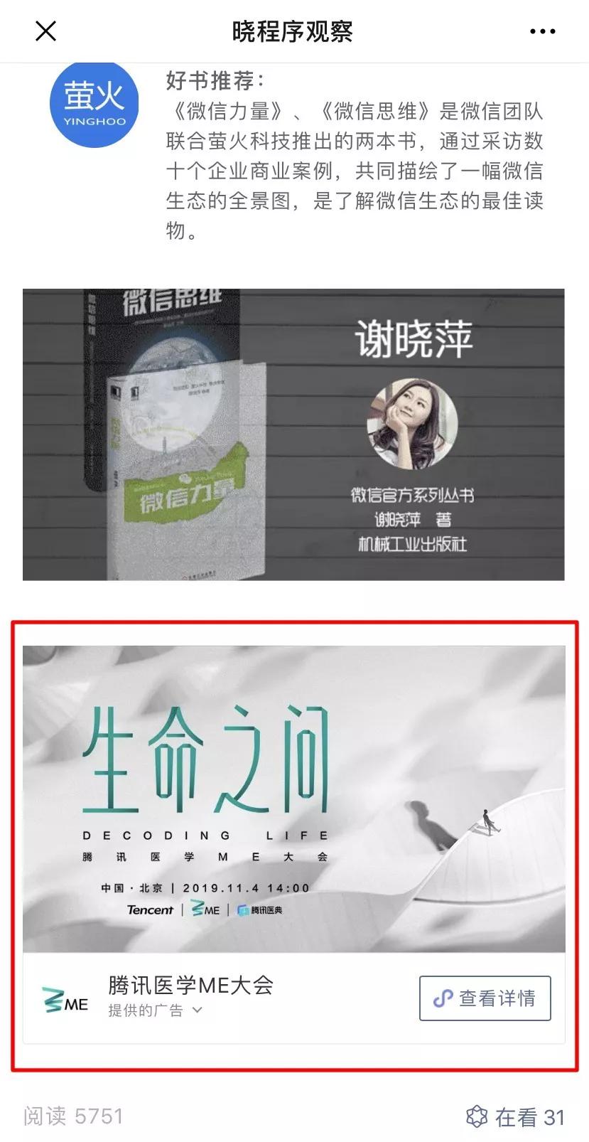 三个入口中,菜单栏完全依靠用户对该公众号的服务产生兴趣,用户自己点击进入小程序,广告则主要是为广告主产生价值,和公众号运营者关系不大。