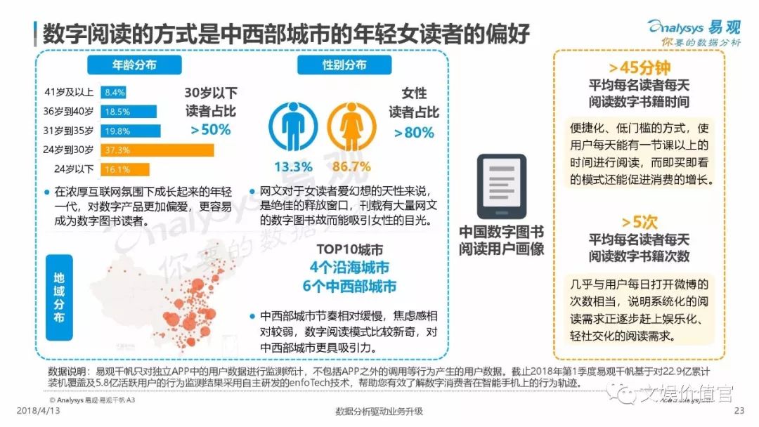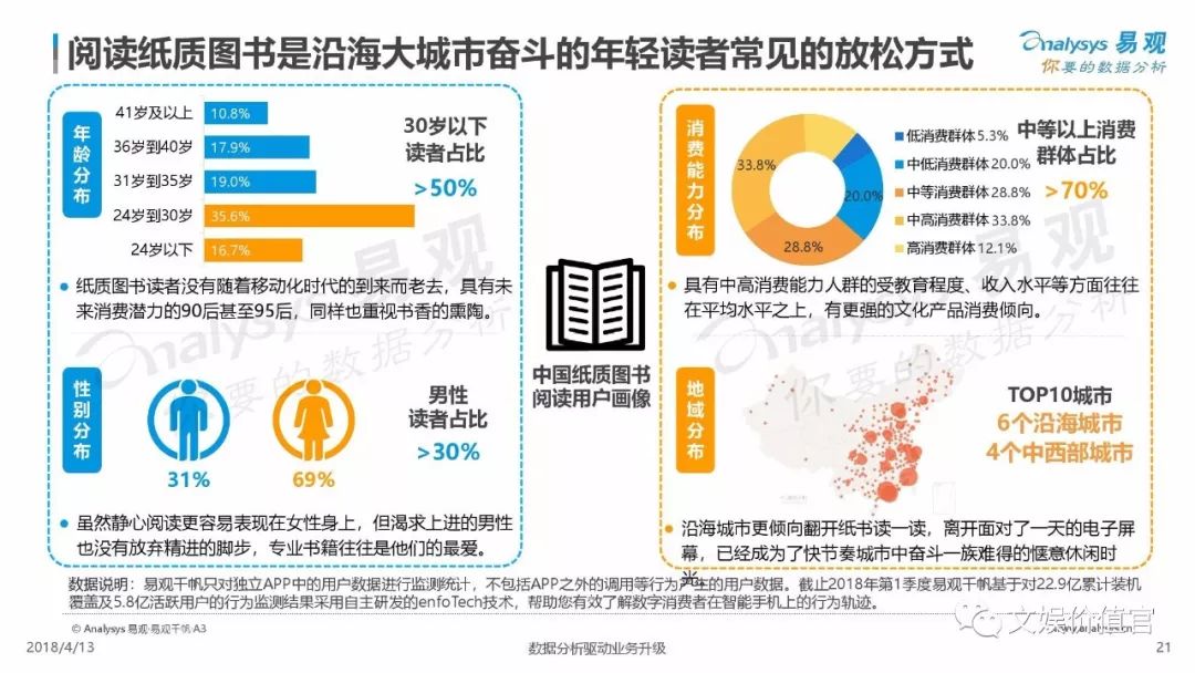 纸质书并未退出历史舞台,数据显示,阅读纸质书甚至成为沿海小镇青年最佳的休闲方式,而30岁以下的读者成为主力图书的消费者;电子书籍阅读集中在西部城市,其中86.7%的读者为女性。由此可见,中国人不仅没有离开阅读,反而呈现出阅读的年轻化趋势。