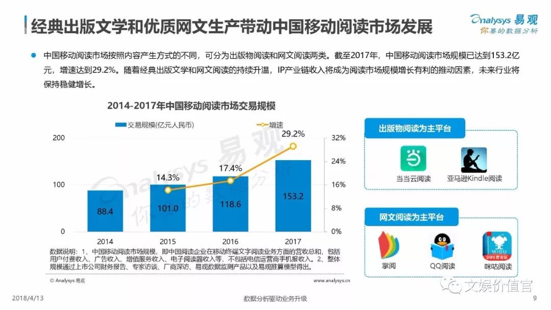从2008年到2016年这期间数字化阅读上升率高达43.7%,人们开始接受并习惯了电子阅读方式。2014年到2017年书籍消费呈现逐年递增的趋势,2017年增长了29%,而中国移动阅读市场规模达到了153.2亿元。