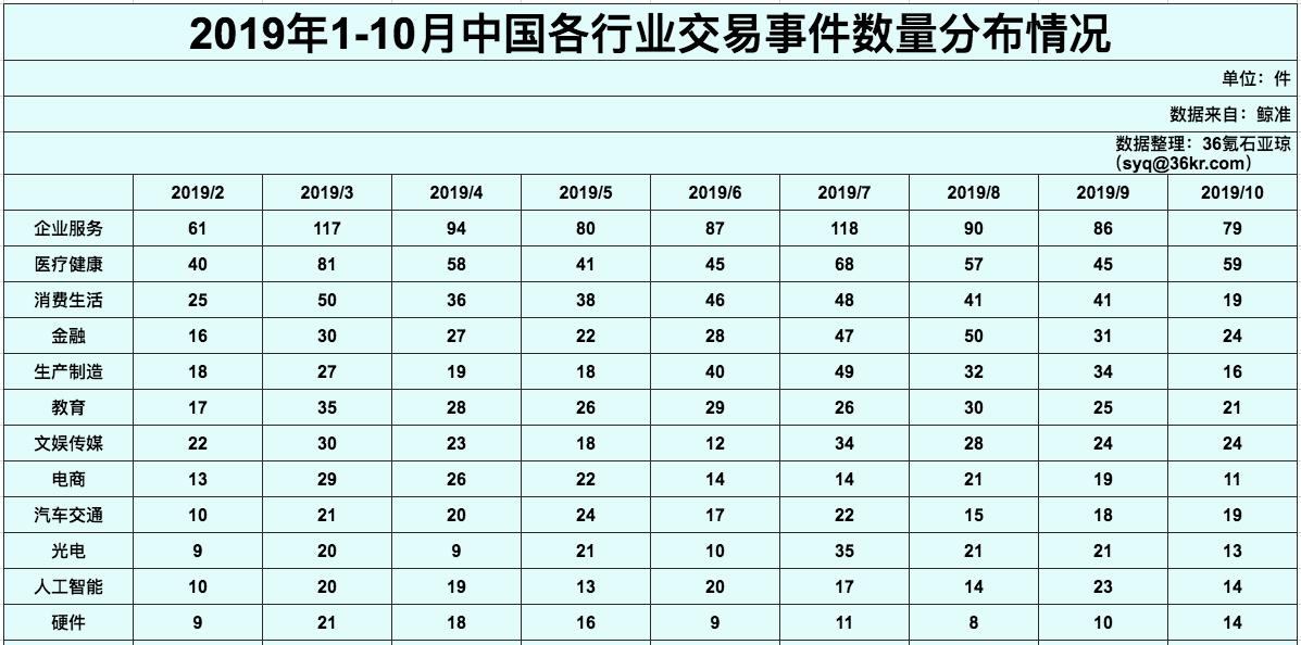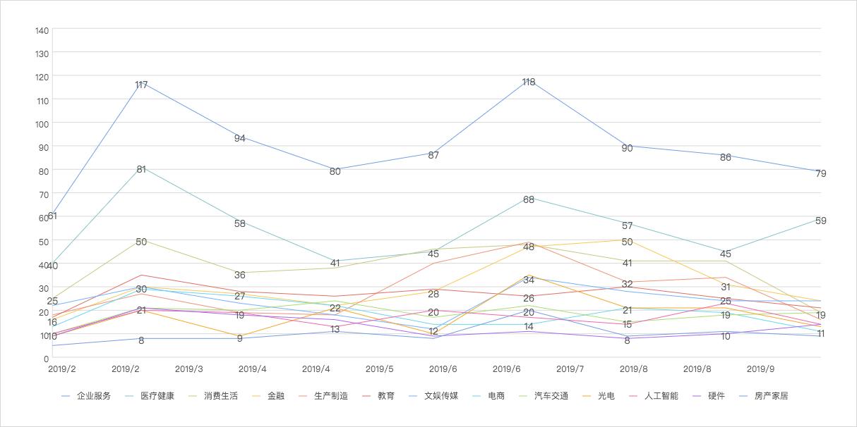 2019年2-10月,企业服务领域共计公布了至少812笔交易,占到了同期融资交易总量(2972笔)的27% ;医疗健康领域共计公布了至少494笔交易,占到了同期融资交易总量的16.7% ;两者合计共计发生了1306笔交易,占到了同期融资交易总量43.7%左右。