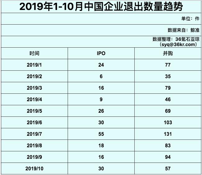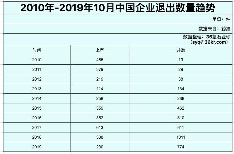 根据公开信息,2019年1-10月,共有230家公司完成上市,约有774家公司完成并购。完成上市公司的数量为近6年来最低。简单推算今年全年并购交易有可能在千笔左右,或与去年持平,正成为主要的退出方式之一。
