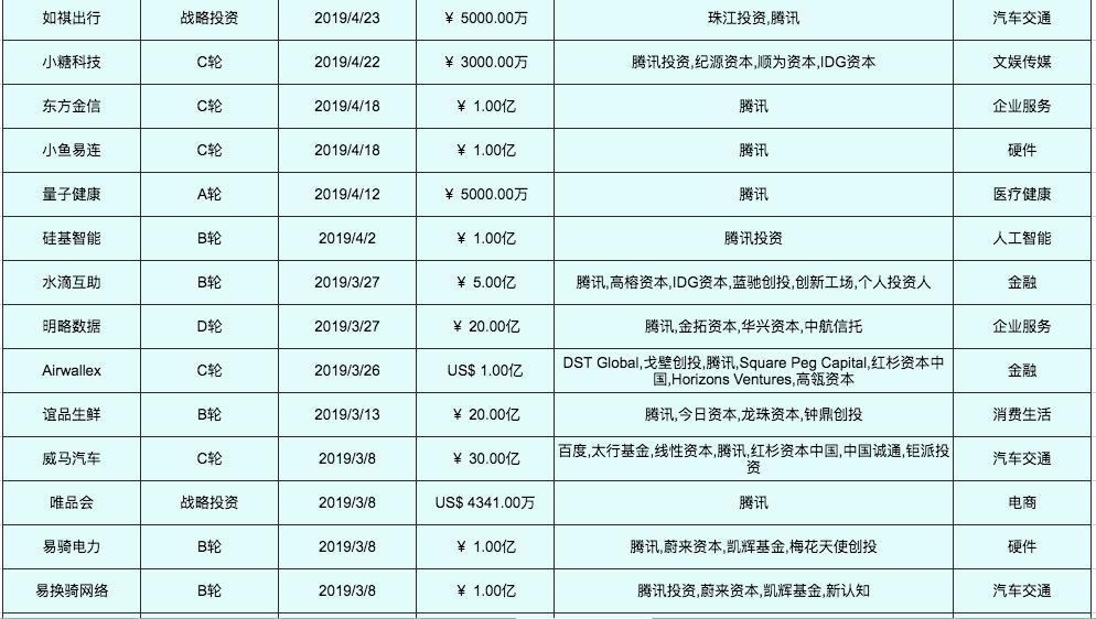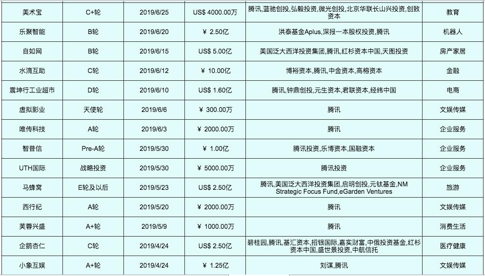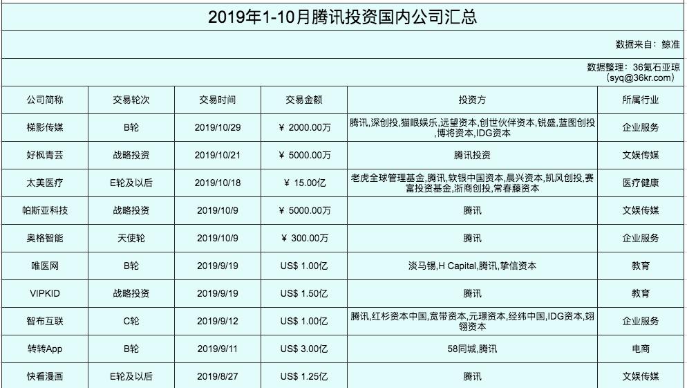 下图为2019年1-10月腾讯参投国内公司的交易汇总。