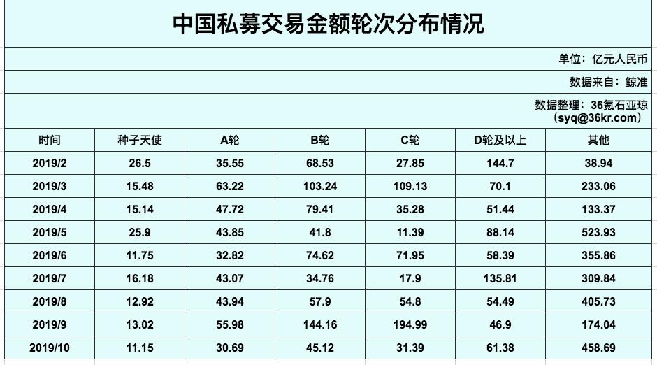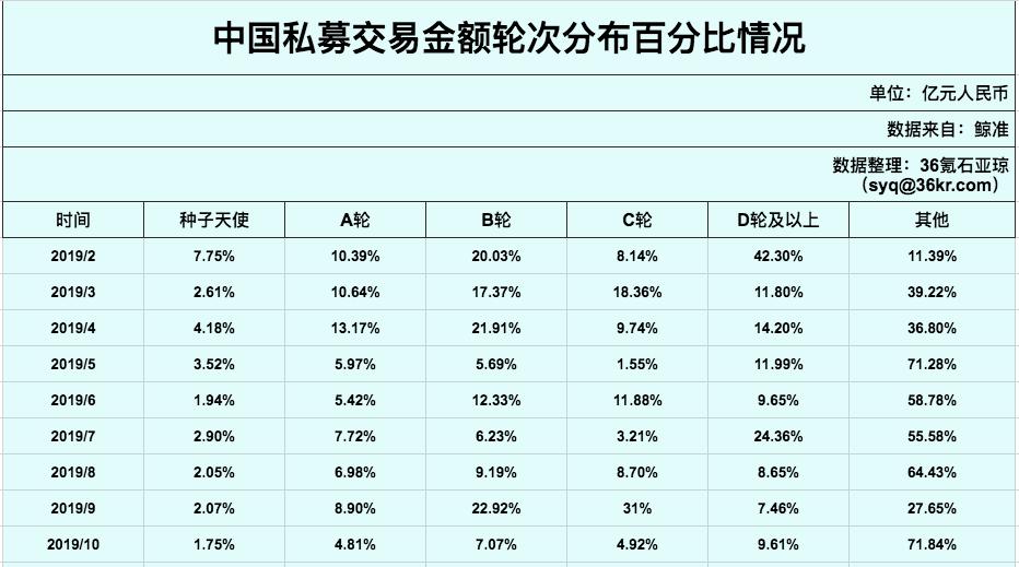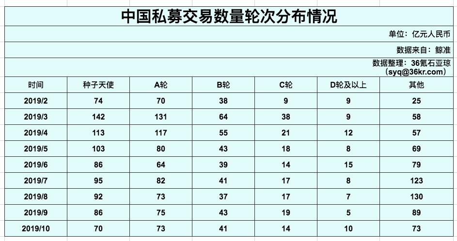 2019年2-10月,平均每月约有16.4亿元投向种子轮公司,44.1亿元流向A轮公司,72.2亿元流向B轮公司,61.6亿元流向C轮公司,79亿元流向D轮公司。