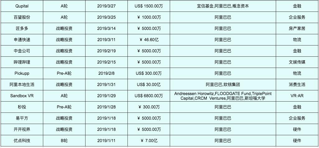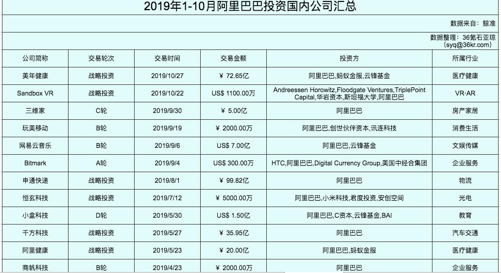 下图为2019年1-10月阿里巴巴参投国内公司的交易汇总。