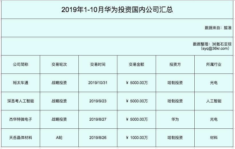 值得关注的是,华为正成为新兴买家。2019年4月,华为成立了全资投资公司哈勃科技投资公司,注册资本是7亿元,由白熠担任董事长。2019年1-10月,华为对外公布的交易还仅为4笔,包括天岳晶体材料、杰华特微电子、深思考、裕太车通。此外,根据业内消息,竹间智能的B+轮融资,华为也有参与。