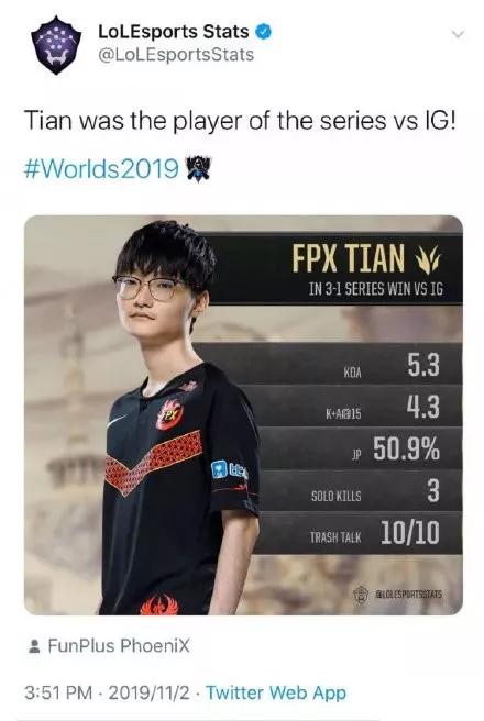时过境迁,今年代表FPX出战S赛的打野选手Tian,今年不过才19岁,但却已经展现出了远超同龄人的老辣。Tian在加入FPX之前,是被誉为“电竞黄埔军校”YM战队的打野,从这支战队里走出的选手还包括了去年S赛的FMVP得主Ning、RNG的辅助Ming、今年LPL的常规赛MVP得主Knight等,无不是年纪轻轻就能够在LPL乃至世界赛上声名远播的新锐。