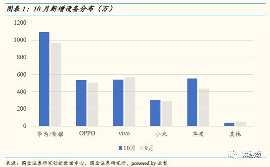 根据国金证券研究创新数据中心的监测数据,多款旗舰机型发布后,10月国内共新增设备数3056万台,同比上升9%,环比下滑25%。华为销量环比上升显著,增量份额提升至36%,继续保持领先;在新机销售持续带动下,苹果增量份额迅速提升至18%,接连超过OPPO、vivo,位居第二。