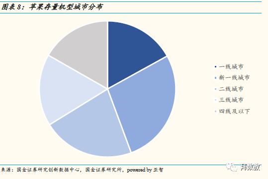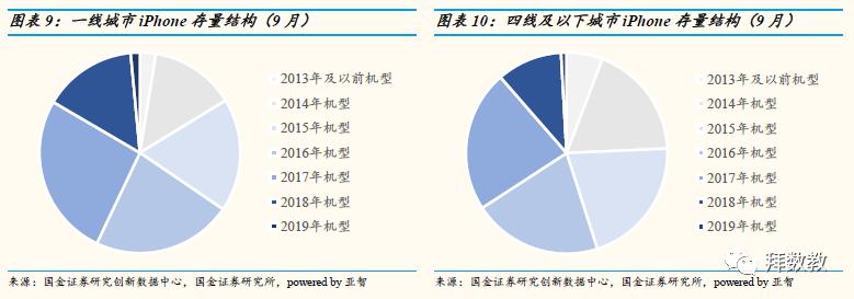 在上个月的报告中,我们提到,在苹果的存量设备中,仍有相当一部分来自于三四线城市,这部分用户仍在使用旧款的iPhone手机。例如,在四线及以下城市中,仍有65% iPhone用户使用的是16年及以前的机型,这部分用户换机周期长,对价格又非常敏感,是苹果的潜在购机对象。