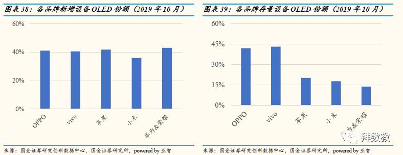 目前,在新增设备中,OLED屏幕占比超过40%左右。在存量设备中,OLED目前渗透率超过28%,仍具发展空间。其中:OLED在OPPO和vivo中渗透率较高,已超过40%,而在华为&荣耀手机中占比仍较低,仅有14%。值得注意的是,随着高端机型的热销,华为新增设备中采用OLED屏的占比已经超过43%,并呈现不断提升的趋势。未来随着可折叠柔性屏技术的不断成熟和应用,预计OLED渗透率将会进一步提高。此外,目前的屏下指纹技术仅适用于OLED屏,屏下指纹的普及将进一步推动OLED屏幕占比的提升。