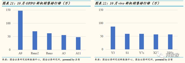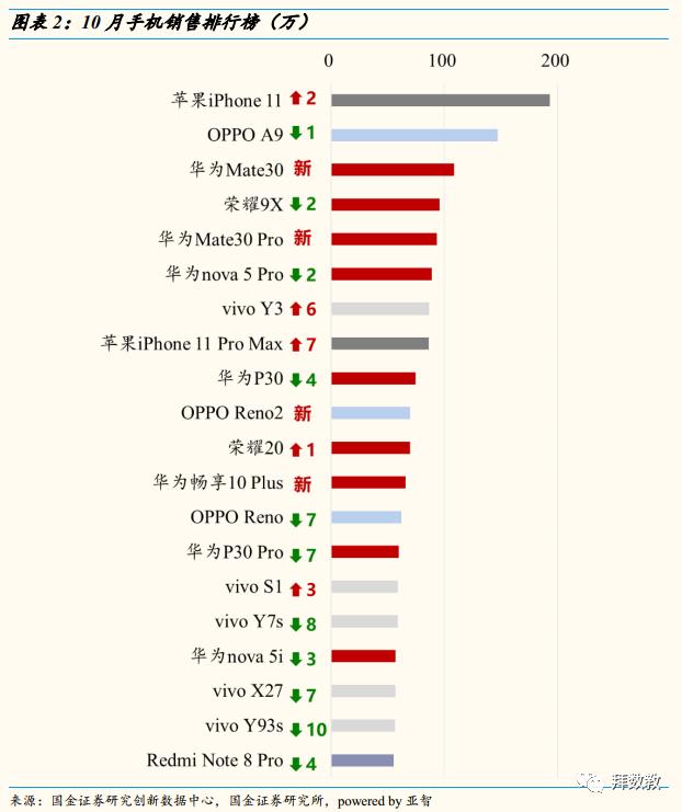 华为占据榜单中的9席,华为新机Mate 30系列销量合计超过200万台,其中高端系列Mate 30 Pro销量超过90万台,由于Mate 30系列5G版尚未发售,因此,部分消费者仍在观望,这也是Mate 30系列稍逊一筹的原因之一。OPPO、vivo上榜机型总数与上月基本持平,但在苹果和华为新机的冲击下排名均略有下滑;红米 Note 8 Pro仍是小米唯一上榜机型,销量超过50万台。