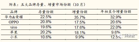苹果新机销量爆棚,华为Mate30系列热销:凭借iPhone 11系列的热销,本月苹果手机的增量份额迅速提升至18%,一举超越OPPO和vivo,位列第二。Mate 30系列迎来首个完整销售月,共计新增设备超过200万台,华为&荣耀的增量份额上升至36%,保持领先优势。本月华为和苹果的市场份额合计接近55%,两强相争,愈战愈强。