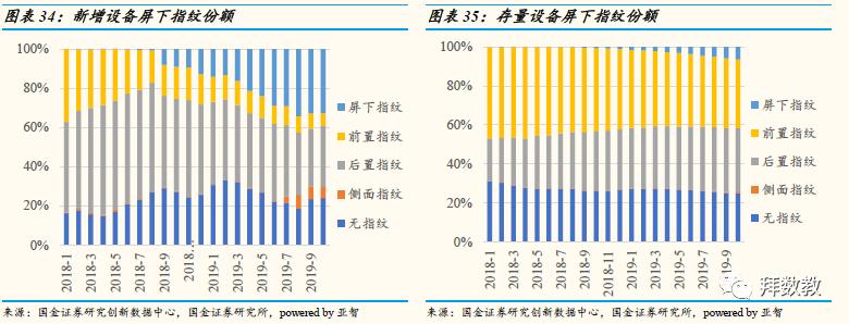 屏下指纹技术在2019年开始进入产业化的爆发期。随着屏下指纹技术的成熟和全面屏的普及,屏下指纹方案有望逐渐成为主流配置。目前,在新增设备中,屏下指纹占比超过32%左右;在存量设备中,屏下指纹占比不足7%,潜在空间巨大。