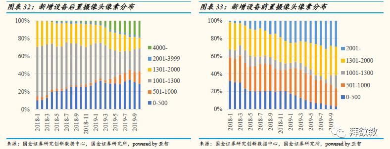 另一方面,40M像素已经逐渐成为后置主摄像头的主流配置,在新增设备的渗透率接近40%。目前搭载4800万摄像头的在售机型数量不断增加,包括OPPO Reno系列、荣耀V20、小米9系列、红米Note 7、K20系列和vivo X27,在新增设备的份额占比已超过了30%,呈现出快速增长趋势。我们认为手机拍照成像效果与专业相机的差距仍然存在,这将驱动厂家在摄像头上持续创新。
