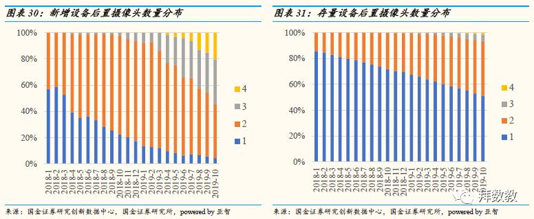 从存量和增量来看,多摄均为未来手机发展趋势。经过多年的发展,后置多摄已得到迅速普及。在新增设备中,已有超过95%的设备采用了后置多摄的方案(其中后置四摄的比例超过20%),在存量设备中,后置多摄的设备比例也已接近50%。苹果此次发布的iPhone新机中,iPhone 11搭载后置双摄1200万像素,主摄+广角;iPhone 11 Pro系列搭载后置三摄1200万像素,主摄+长焦+广角,摄像头数量相对去年同期的新机,均增加一枚。可以看出,多摄将是未来手机摄像头更新迭代的重要趋势。