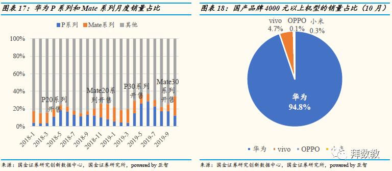 Mate 30系列显然战胜了前一代Mate 20系列,但不及P30,一方面,5月受“实体清单”影响,国内消费者爱国情怀高涨,助推P30销量,另一方面Mate 30 系列5G机型尚未开售,部分消费者仍在观望。