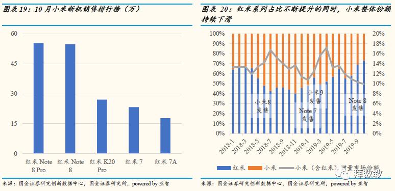 今年年初,随着红米Note 7系列的发售,红米系列的销量占比在不断提升,一度推动小米的整体增量份额上升至接近18%。今年2月份小米发布了旗舰机小米9系列,然而根据国金证券研究创新数据中心的数据,小米9系列发售以来累计销量不足550万台。