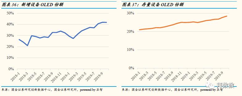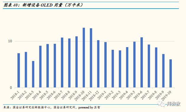 OLED渗透率逐步提高的同时,全面屏、大屏化趋势也推动了OLED用量的提升。根据国金证券研究创新数据中心的数据,10月新增设备OLED用量超过6万平米,2019年初至今OLED用量达87万平米。