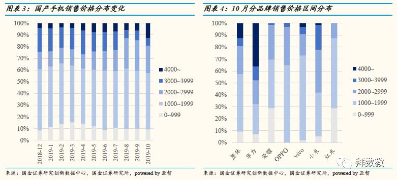现代人的生活早已离不开手机,手机的角色也不再局限于通讯工具,而是渗透到了生活中的方方面面。因此,手机厂商依靠“价廉”难以获得更多的用户,“物美”则更为重要。从国产手机价格分布来看,10月,多款旗舰机发布,提升高端机占比,4000元以上占比超10%。具体分品牌来看,华为高端机型占比超过了30%;OPPO、vivo主打1000~1999价位段机型,并尝试向更高价位段渗透;红米、荣耀主打中低端。
